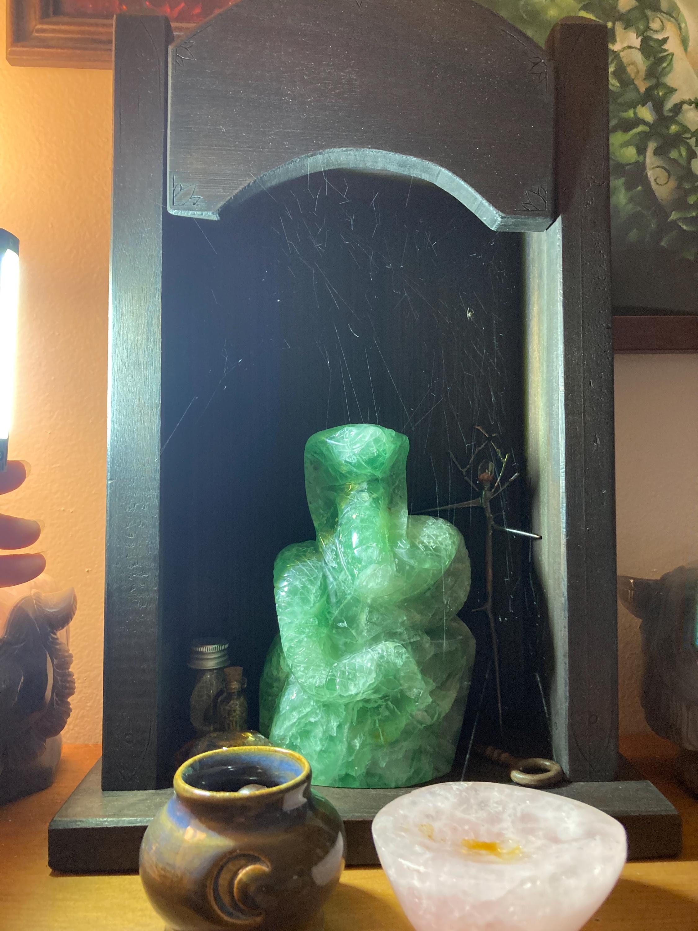 Rustic Altar Box, befitting of statues and photos or candles. a safe space to decorate and dedicate. Decorative woodburn designs adorn the exterior, neutral and welcoming of any faith.
