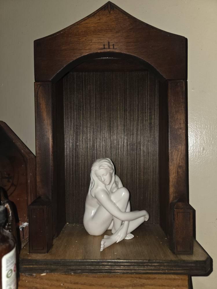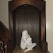 Rustic Altar Box, befitting of statues and photos or candles. a safe space to decorate and dedicate. Dorative woodburn designs adorn the exterior, neutral and welcoming of any faith.